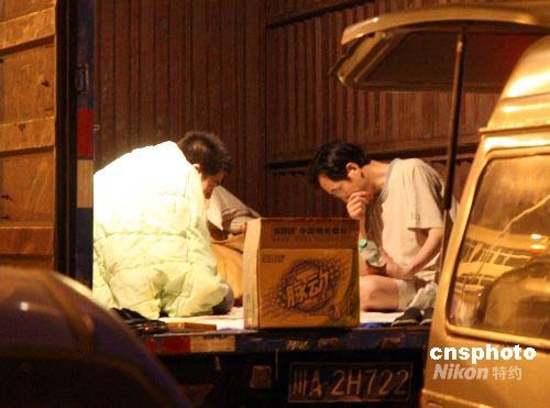 5月12日晚,成都的眾多市民均聚集在空曠地區(qū)或廣場過夜。據(jù)悉,截至13日零點(diǎn),四川災(zāi)區(qū)死亡人數(shù)已達(dá)近萬人。圖為兩名當(dāng)?shù)厥忻裨谕T趶V場邊的貨車箱內(nèi)過夜。中新社發(fā) 郭晉嘉 攝