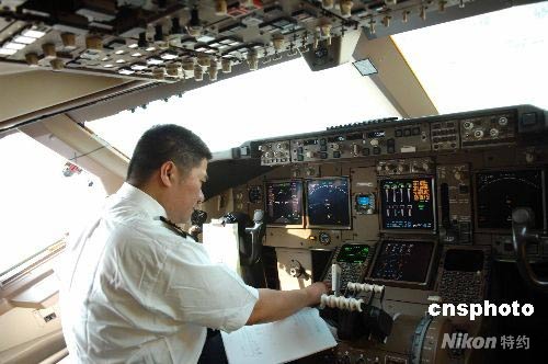 五月十三日,深航旗下中德合資翡翠航空大型貨機(jī)747-400/JI7451受命運(yùn)輸?shù)卣鹁葹?zāi)物資,從天津?qū)?guó)家救災(zāi)帳篷等二百四十八噸物資專機(jī)緊急運(yùn)往地震災(zāi)區(qū)。圖為深航副總裁劉清貴做飛行前準(zhǔn)備。中新社發(fā) 陳文 攝