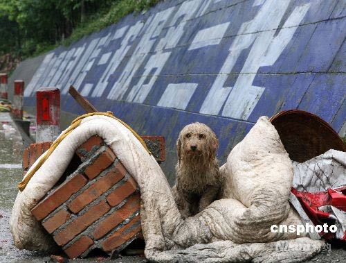 5月13日,四川地震重災(zāi)區(qū)綿陽市北川縣路邊,一只小狗孤獨地淋在雨中瑟瑟發(fā)抖。中新社發(fā) 郭晉嘉 攝