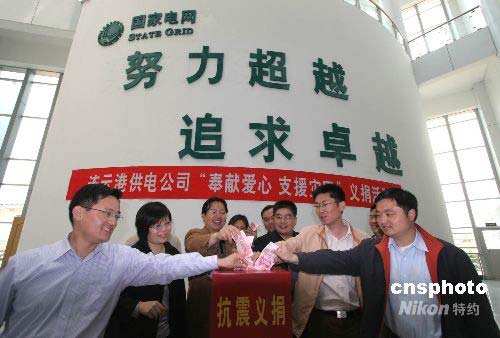 5月14日,供電員工為地震災(zāi)區(qū)捐款。當(dāng)天,江蘇連云港供電公司組織“奉獻(xiàn)愛心,支援災(zāi)區(qū)”義捐活動(dòng),供電員工紛紛用捐款的方式表達(dá)對(duì)災(zāi)區(qū)人民的深切關(guān)注之情。中新社發(fā) 耿玉和 攝