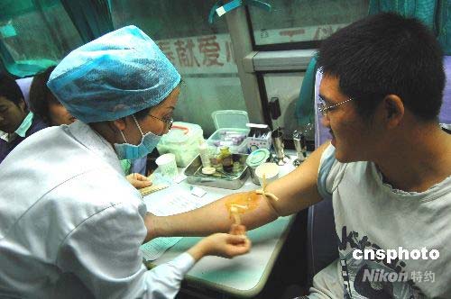 5月14日,重慶市西南大學(xué)育才學(xué)院近500名同學(xué)冒著大雨排隊(duì)獻(xiàn)血。重慶市合川區(qū)血液中心來(lái)到校園進(jìn)行采集血液,引起了大量學(xué)生的踴躍報(bào)名獻(xiàn)血,場(chǎng)面一度失控。同學(xué)們血脈相通汶川,紛紛表示了對(duì)災(zāi)區(qū)人民的慰問之情。血液中心負(fù)責(zé)人介紹說,當(dāng)天采集了200余名學(xué)生的血液,將馬上運(yùn)送到最需要的災(zāi)區(qū)。中新社發(fā) 許康平 攝