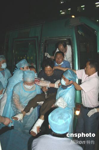 5月15日23時,又一批90名從地震重災區(qū)四川綿竹市的傷員,被連夜運到眉山市第二人民醫(yī)院,當地醫(yī)務人員、青年志愿者和剛剛趕到這里增援的吉林省醫(yī)療隊等數百人齊心協(xié)力,經過1個小時的奮斗后把這批傷員安置到病房,并立即展開救治。中新社發(fā) 堯遙 攝
