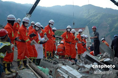 5月15日,重慶消防官兵在四川地震重災區(qū)北川縣北川中學現(xiàn)場清理廢墟上的磚塊,尋找幸存者。中新社發(fā) 萬明 攝