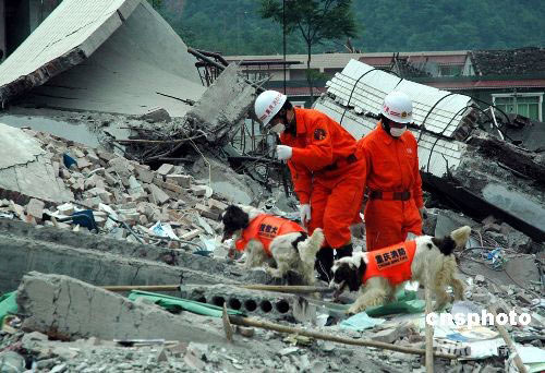 5月15日,四川地震重災(zāi)區(qū)北川縣,重慶消防官兵動用搜救犬在北川中學(xué)廢墟中搜尋幸存者。中新社發(fā) 萬明 攝