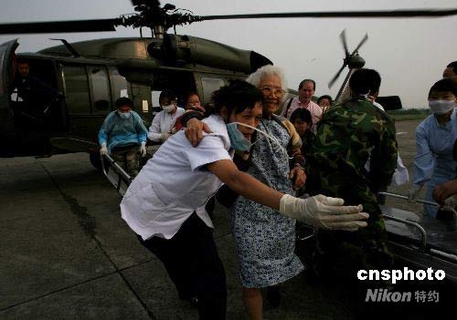 五月十六日下午,二十六名境外游客從汶川大地震被稱為“孤島”的茂縣登上救援的中國空軍黑鷹直升機,平安撤到四川省會成都。這批來九寨溝旅游的二十三位馬來西亞華人女性團隊中,歲數(shù)最大的游客已經(jīng)九十歲。同機還有兩位巴西華人母女游客和一位加拿大男青年,她們被困在地震災(zāi)區(qū)已經(jīng)四天。中新社發(fā) 賈國榮 攝
