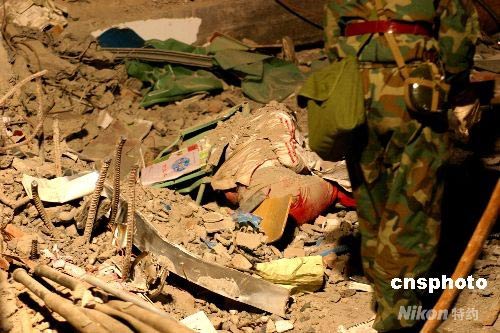 “五·十二”震災讓北川中學幾乎被夷為平地,數(shù)以百計的師生被掩埋。到十六日凌晨,從廢墟里面再挖出生命的希望越來越渺茫,救援隊員們還在繼續(xù)工作。中新社發(fā) 孫宇挺 攝