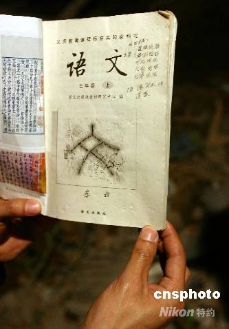 初三學生孫丹梅的父親仍在現(xiàn)場守候,他不停地翻動那些在廢墟中發(fā)現(xiàn)的書本,查看里面孩子的名字和班級。
