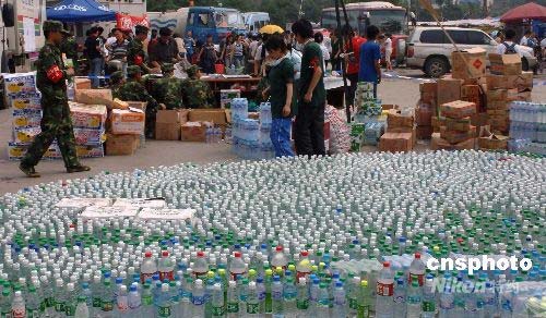 5月中旬, 來自四面八方的抗震救災(zāi)物資物品正在源源不斷地運(yùn)往四川地震災(zāi)區(qū)。都江堰市一個災(zāi)民聚集點(diǎn)里,一度趨于緊張的飲用水供應(yīng)已經(jīng)出現(xiàn)好轉(zhuǎn),各種不同品牌的瓶裝水被排列成地震災(zāi)區(qū)的巨大圖形,時(shí)刻警醒著人們。中新社發(fā) 鄒憲 攝