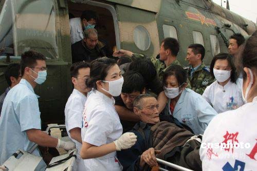 連日來,中國空軍連續(xù)出動(dòng)軍用直升機(jī)到四川重災(zāi)區(qū)緊急搶運(yùn)危重傷員,及時(shí)送到成都進(jìn)行救治,為挽救幸存者生命贏得時(shí)間。圖為5月15日,空軍航空兵某搜救團(tuán)轉(zhuǎn)移傷員的情景。中新社發(fā) 譚超 攝
