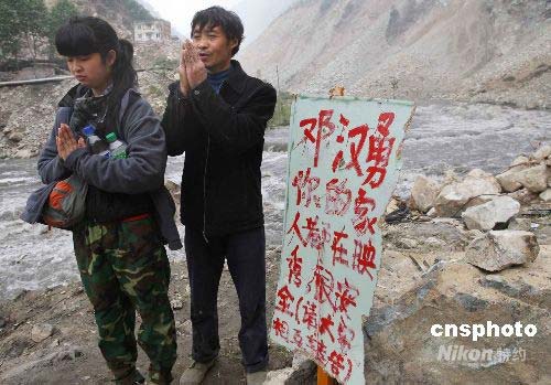 5月17日上午,在四川省汶川大地震中幸存的49歲映秀鎮(zhèn)頭道村農(nóng)民鄧云祥和女兒鄧小琴,在通往家鄉(xiāng)的必經(jīng)之地插上告示牌,企望失蹤的兒子鄧漢勇能夠平安歸來(lái)。鄧云祥的家鄉(xiāng)在映秀鎮(zhèn)通往臥龍大熊貓保護(hù)區(qū)的303國(guó)道8公里處,至今這條通往臥龍的道路幾乎全線被山體滑坡所覆蓋。中新社發(fā) 任晨鳴 攝