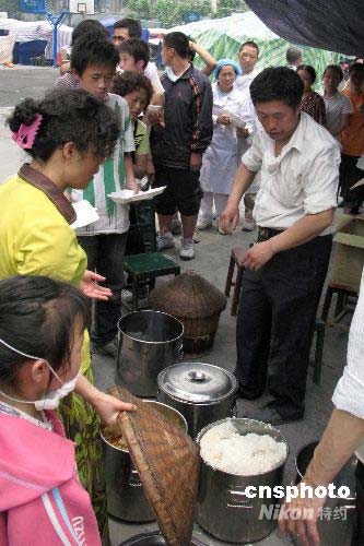 5月16日,四川都江堰一防震棚區(qū)民眾吃午餐時得到80公里外一蔡姓農(nóng)民全力救助。5月12日中國汶川大地震使四川都江堰市內絕大部分建筑出現(xiàn)致命性破壞,造成許多人員傷亡。居民自建許多防震棚,并在大棚中集體生活就餐。中新社發(fā) 鄒憲 攝