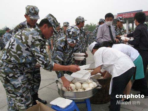 五月十六日十二點二十分許,一支從海南星夜兼程趕來的、有一千余名官兵組成的抗震救災(zāi)隊伍到達成都成南高速路口加油站,早早等候在這里的成飛賓館工作人員,迅速為戰(zhàn)士們提供上盒飯、饅頭等飯菜。僅二十分鐘戰(zhàn)士們就用完飯菜,稍事休整后就出發(fā)趕往受災(zāi)。中新社發(fā) 周丹鈺 攝