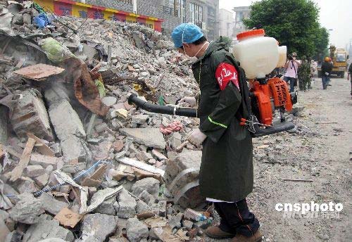 五月十七日,是汶川地震發(fā)生時間第六天,地震災(zāi)區(qū)都江堰市最大的市場荷花池市場已開始用大型挖掘機(jī)、裝載機(jī)清理倒塌的樓房和廢墟,并有專業(yè)人員進(jìn)行防疫消毒。中新社發(fā) 周丹鈺 攝