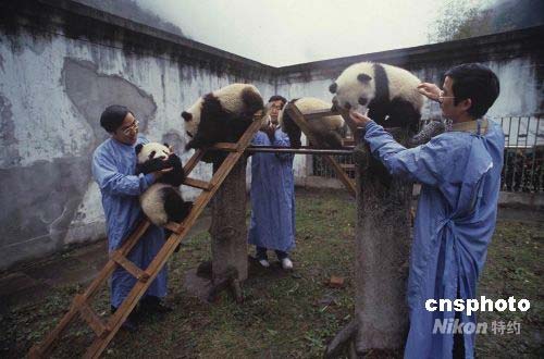 四川省汶川縣發(fā)生里氏7.8級強(qiáng)烈地震后,位于震中的臥龍大熊貓保護(hù)區(qū)通訊和交通全部中斷,與外界失去聯(lián)系。16日,兩名保護(hù)區(qū)工作人員攜帶衛(wèi)星電話坐直升飛機(jī)降落到臥龍以后,得到最新消息:繁育基地的大熊貓圈舍損毀嚴(yán)重,14座完全損毀,18座嚴(yán)重?fù)p毀,但因為有圍墻,絕大部分大熊貓目前安全。幼仔已被轉(zhuǎn)移到平緩的安全地帶,但暫住條件相對擁擠。圖為地震之前,臥龍研究人員在精心照顧大熊貓幼仔。中新社發(fā) 羅小韻 攝
