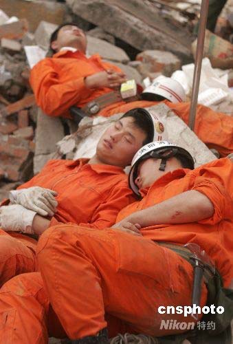 5月17日,在四川省什邡市鎣華鎮(zhèn)、紅白鎮(zhèn)等搶險現(xiàn)場,連續(xù)作戰(zhàn)的洛陽消防搶險救援突擊隊隊員們躺在瓦礫上小憩片刻。在四川地震災(zāi)區(qū),解放軍、武警、公安、邊防、消防官兵以及民兵、醫(yī)療救護(hù)人員和志愿者們,不怕危險,不畏疲勞,為搶救每一條寶貴的生命連續(xù)奮戰(zhàn)。他們是最可愛的人!中新社發(fā) 張曉理 攝