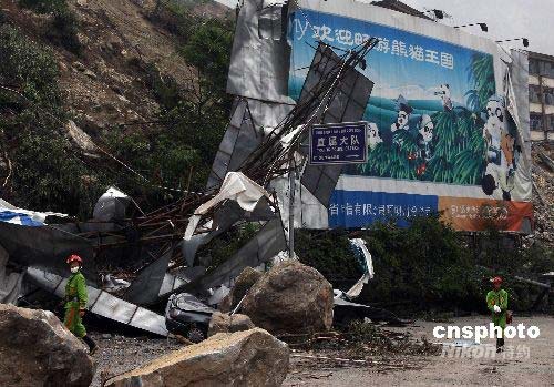 兩名武警搜救隊員5月17日在映秀鎮(zhèn)通往臥龍的303公路上巡查。5月12日發(fā)生的四川汶川大地震,將映秀鎮(zhèn)通往中國國寶大熊貓最主要保護區(qū)臥龍的303公路幾乎徹底摧毀。有專家稱,這條公路短期內無法修復。中新社發(fā) 任晨鳴 攝