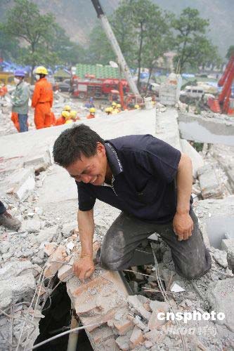 5月17日中午12時30分左右,北川中學高二八班17歲的學生熊文碧父親特地從浙江溫州趕回,找到女兒上課的教室后,跪尋女兒身影。中新社發(fā) 劉震 攝