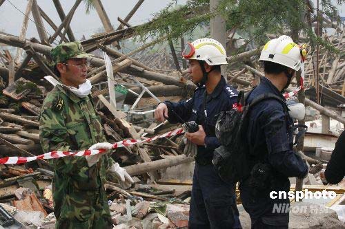5月17日,救援隊隊員攜帶救援犬在紅白鎮(zhèn)一處廢墟搜救。當(dāng)日凌晨,55名新家坡國際救援隊隊員攜帶專業(yè)設(shè)備乘專機(jī)抵達(dá)成都雙流機(jī)場后,馬上轉(zhuǎn)汽車抵達(dá)什邡市紅白鎮(zhèn),與中國人民解放軍四川預(yù)備役官兵協(xié)同開始開展救援行動。中新社發(fā) 鐘 敏 攝