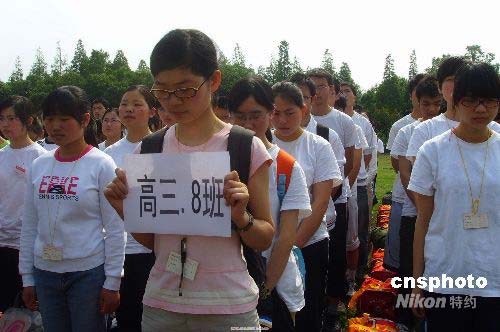 5月19日上午10點(diǎn),在北川中學(xué)高三學(xué)生復(fù)課儀式上,同學(xué)們默哀悼念故者。中新社發(fā) 霍潺 攝