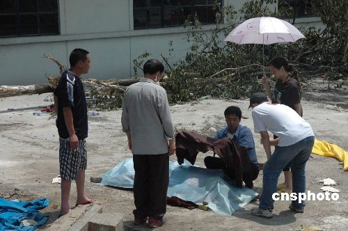 53歲的四川綿竹東方汽輪機(jī)廠女職工王發(fā)珍創(chuàng)造了生命最光輝奇跡,她在汶川大地震當(dāng)天被埋在六層樓房下,七天之后的5月19日上午被搶救出來,還呼喊著救命,但終因搶救無效死亡。圖為她的兒子(右二)用一件衣服為母親遺體遮擋太陽,久久不愿離去。中新社發(fā) 肖龍聯(lián) 攝