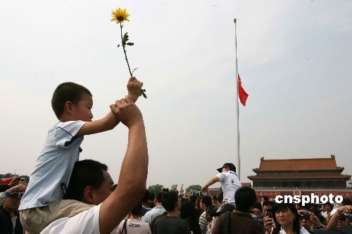 5月19日14時(shí)28分,數(shù)萬民眾在北京天安門廣場(chǎng)為四川汶川大地震遇難者默哀,一名兒童騎在父親肩頭高舉黃菊花表達(dá)哀思。5月19日至21日為中國(guó)全國(guó)哀悼日。中新社發(fā) 王瑤 攝