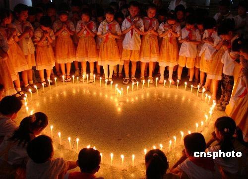 圖:小學(xué)生點(diǎn)燃蠟燭為災(zāi)區(qū)祈禱