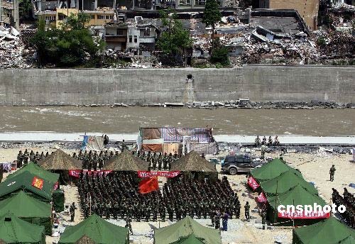 圖:在地震核心重災(zāi)區(qū)映秀鎮(zhèn)的救險官兵默哀