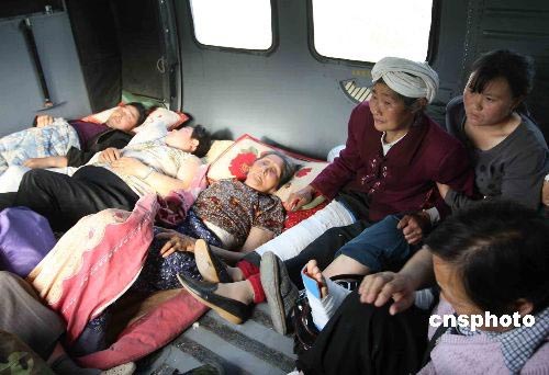 5月19日,鐵軍官兵翻山越嶺6個多小時到達阿壩藏族羌族自治州三江鄉(xiāng),將包括10名藏族災民在內(nèi)的15名重傷員利用直升機運往成都進行救治。中新社發(fā) 曾憲平 攝