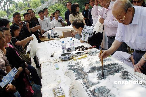 五月二十日,書畫家在鄭州紫荊山公園作畫賑災。當日,由河南省慈善總會、省文化廳主辦,河南省嵩陽書畫院承辦的“翰墨丹青獻愛心”大型賑災書畫義賣活動在此舉行,所得善款將全部轉至四川地震災區(qū)。 中新社發(fā) 李志全 攝