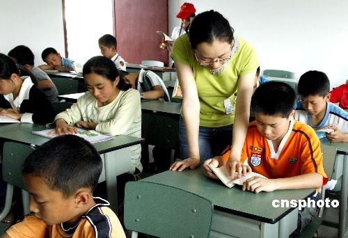 5月19日,來自地震重災(zāi)區(qū)的孩子在四川省成都市新都區(qū)“愛心學(xué)!钡恼n堂上接受老師輔導(dǎo)。全國(guó)首所專門為地震重災(zāi)區(qū)孩子開辦的“愛心學(xué)!保18日上午在四川省成都市新都區(qū)新繁鎮(zhèn)正式開課。首批就讀的166名孩子,分別來自彭州、都江堰、綿竹等重災(zāi)區(qū),有的孩子在震災(zāi)中失去了父母。新都區(qū)從各個(gè)學(xué)校抽調(diào)了近20名經(jīng)驗(yàn)豐富、有敬業(yè)精神和愛心的教師任課,并給學(xué)校安排了2名有資質(zhì)的優(yōu)秀心理健康輔導(dǎo)老師。