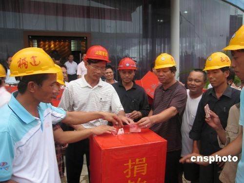 5月19日下午,海南文昌一家工地的渝、湘籍農(nóng)民工,自發(fā)組織為四川汶川地震受難者默哀3分鐘,隨后為災區(qū)同胞捐款獻愛心。圖為農(nóng)民工慷慨解囊為災區(qū)捐款。中新社發(fā) 付美斌 攝