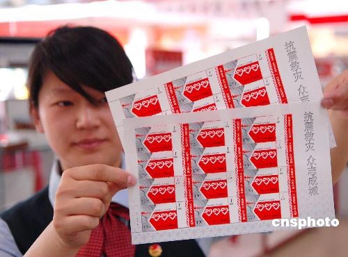 2008年5月20日,濟(jì)南市郵政局趵突泉郵電支局員工展示《抗震救災(zāi) 眾志成城》賑災(zāi)郵票。為進(jìn)一步向地震災(zāi)區(qū)提供社會(huì)援助,當(dāng)日,中國(guó)郵政特別發(fā)行《抗震救災(zāi) 眾志成城》賑災(zāi)附捐郵票一套一枚,售價(jià)2.20元,其中郵票面值1.20元,附捐金額1元。該套郵票采用主、附票形式,畫面表現(xiàn)了全國(guó)各族人民在嚴(yán)重的地震災(zāi)害面前手拉手、心連心,眾志成城的堅(jiān)定意志和無私奉獻(xiàn)精神。據(jù)了解,為了表達(dá)全體郵政員工對(duì)地震災(zāi)區(qū)人民的情誼,中國(guó)郵政集團(tuán)公司決定將此套郵票的全部郵資收入1560萬元和附捐款1300萬元,共計(jì)2860萬元通過民政部門捐贈(zèng)地震災(zāi)區(qū)。中新社發(fā) 崔鵬森 攝