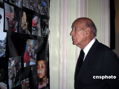 圖:法國(guó)前總統(tǒng)德斯坦悼念汶川遇難者