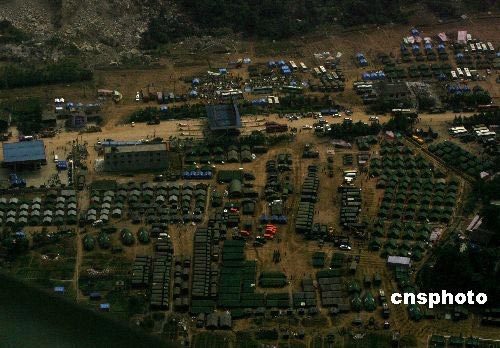 五月二十日,從空中俯瞰北川縣重災區(qū)外圍,救援部隊和縣政府已建立起一座新的帳篷城。中新社發(fā) 賈國榮 攝