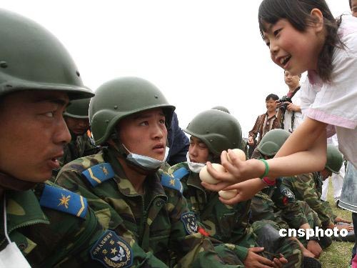 5月20日,四川德陽地區(qū)受災(zāi)民眾手捧家中的雞蛋慰問解放軍官兵。中新社發(fā) 趙振清 攝