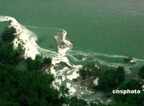 五月二十日,北川重災(zāi)區(qū)的“定時(shí)炸彈”--堰塞湖水位上漲危急萬(wàn)分。一座大山的崩塌堵塞河道形成危險(xiǎn)的堰塞湖,如果潰堤將淹沒(méi)下游北川全縣和綿陽(yáng)災(zāi)區(qū)。目前蓄水已經(jīng)淹沒(méi)了上游的一些鄉(xiāng)村。中新社發(fā) 賈國(guó)榮 攝