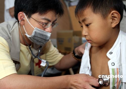 5月21日上午,臺(tái)灣紅十字醫(yī)療隊(duì)在四川省廣漢市高坪鎮(zhèn)災(zāi)民安置中心安營(yíng)扎寨開(kāi)展醫(yī)療救治。醫(yī)療隊(duì)的外科醫(yī)生李俊秀先生(左)耐心地為10歲男童黃世文診病。黃世文是汶川地震重災(zāi)區(qū)什邡市龍居村的小學(xué)生,地震發(fā)生時(shí)被掩埋在教學(xué)樓三層的樓道內(nèi),經(jīng)過(guò)鄉(xiāng)親們?nèi)齻(gè)小時(shí)的營(yíng)救幸免于難;但是同班六十多個(gè)小朋友中死亡四十多人的悲慘事實(shí),令這個(gè)以前不知愁滋味的孩子變得心事重重,整日寡言少語(yǔ)。中新社發(fā) 任晨鳴 攝