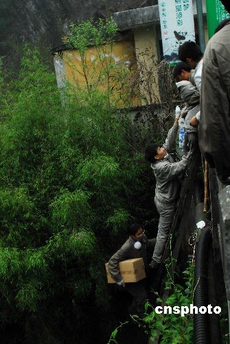 5月12日四川發(fā)生大地震后,臥龍保護(hù)區(qū)管理局的職工于第一時間將大熊貓轉(zhuǎn)移到安全地帶。臥龍保護(hù)區(qū)工作人員是這樣給熊貓運(yùn)送食物。中新社發(fā) 臥龍人 攝