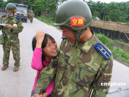 5月21日,中國(guó)空降兵某團(tuán)官兵在洛水鎮(zhèn)下院村幫助村民恢復(fù)生產(chǎn)。失去雙親的12歲女孩李佳見(jiàn)到解放軍就像親人一樣依戀。中新社發(fā) 劉烊宏 攝