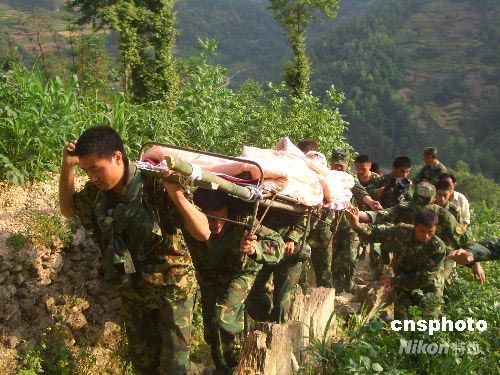 濟南軍區(qū)某摩步師黨員突擊隊跋山涉水轉移傷員。中新社發(fā) 魏國 攝