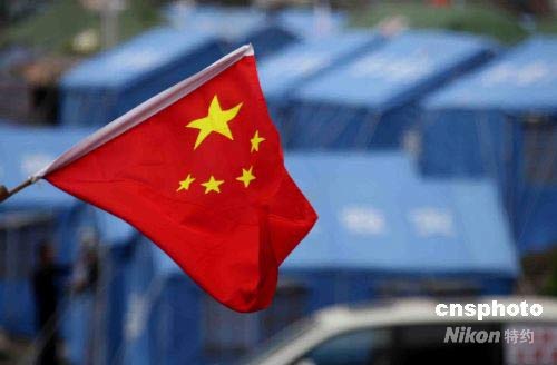 5月22日,五星紅旗在映秀臨時救助地上空飄揚。中新社發(fā) 曾憲平 攝