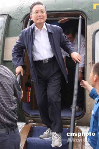 5月24日,中國總理溫家寶乘成都軍區(qū)陸航團的直升飛機抵達汶川大地震重災區(qū)映秀鎮(zhèn),與聯(lián)合國秘書長潘基文會晤。中新社發(fā) 賈國榮 攝