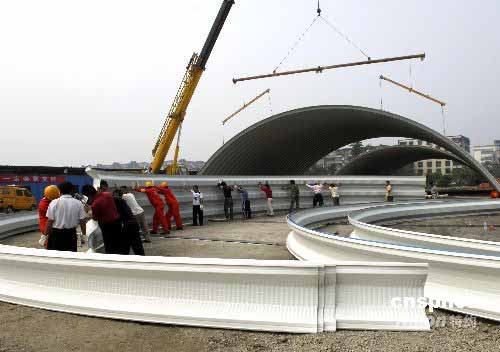 24日,由成都市新都區(qū)組織上千名工人,投資4000萬(wàn)元,在都江堰市觀鳳小區(qū)為受災(zāi)群眾援建的安置房落成,2000受災(zāi)群眾找到了新家。精心的設(shè)計(jì),人性化的布置,受到了當(dāng)?shù)厥転?zāi)群眾的拍手稱贊。圖為工人們正在搭建鋼制拱型餐廳。中新社發(fā) 劉亮 攝