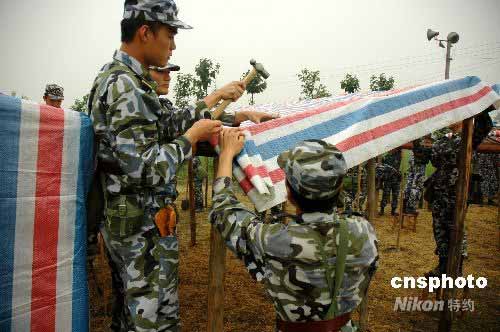 5月25日,中國海軍陸戰(zhàn)隊某旅官兵為四川綿竹市東北鎮(zhèn)赤竹村受災民眾緊急搭建簡易住房。汶川大地震發(fā)生后,四川綿竹市東北鎮(zhèn)赤竹村房屋幾乎被夷為平地,財產損失頗為嚴重。中國海軍陸戰(zhàn)隊從24日起開始為村里搭建簡易住房。中新社發(fā) 李唐 攝