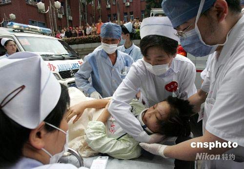 5月25日下午4時(shí)55分,從四川地震災(zāi)區(qū)轉(zhuǎn)運(yùn)福建省救治的第一批20名傷病員,安全抵達(dá)福建醫(yī)大附屬協(xié)和醫(yī)院。福建省首批接收的110名地震災(zāi)區(qū)傷員,于25日下午和晚上分乘3架專機(jī)從成都飛抵福州。傷員們分別安排在南京軍區(qū)福州總醫(yī)院、省立醫(yī)院、福建醫(yī)大附屬協(xié)和醫(yī)院、福建醫(yī)大附屬第一醫(yī)院、省人民醫(yī)院、福州市第一醫(yī)院等6家醫(yī)院救治。中新社發(fā) 楊婀娜 攝