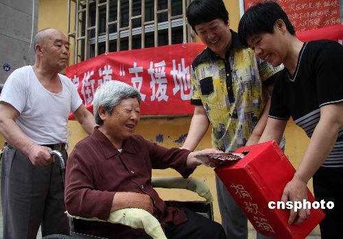 5月27日,退休老人張世俊(左一)推著老伴來到捐款站,把節(jié)儉下來的5000元錢投進捐款箱。這是老夫妻倆第三次為地震災區(qū)捐款獻愛心。汶川大地震發(fā)生后,張世俊、李愛玲夫婦先后三次把省吃儉用的2萬元錢捐給地震災區(qū),在當地被傳為佳話。中新社發(fā) 吉 喆 攝