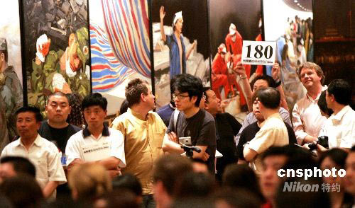 5月28日凌晨,“共同渡過·中國當(dāng)代藝術(shù)界賑災(zāi)義拍”在北京圓滿落幕,值得一提的是,由29名寫實(shí)畫派藝術(shù)家集體創(chuàng)作的以抗震救災(zāi)為主題的油畫作品參與了拍賣,并在43輪競價(jià)后拍出了3350萬元的天價(jià)。這場拍賣持續(xù)4個(gè)小時(shí),全場總成交額一舉突破5100萬元人民幣,全部拍賣所得將通過中華慈善總會(huì)捐獻(xiàn)四川地震災(zāi)區(qū)。中新社發(fā) 楊可佳 攝