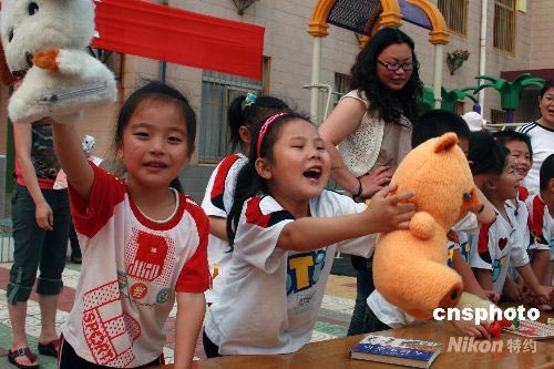 5月28日上午,河南油田五一社區(qū)黃山幼兒園開展“油城飄起黃絲帶,師幼愛心獻(xiàn)災(zāi)區(qū)”義賣捐款活動(dòng)。200多名小朋友把自己平時(shí)喜愛的玩具、課外書等拿出來(lái)義賣,在園內(nèi)擺起一個(gè)個(gè)“愛心”小攤。幼兒園將義賣款項(xiàng)做為孩子們“六一”兒童節(jié)的愛心禮物,捐獻(xiàn)給四川災(zāi)區(qū)的小朋友。中新社發(fā) 李永哲 攝