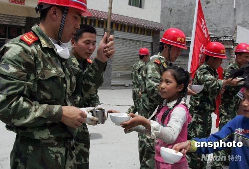 武警交通直屬工程部經(jīng)過(guò)6天奮戰(zhàn),5月27日終于打通了臥龍至“孤島”耿達(dá)的“生命線”,各種給養(yǎng)補(bǔ)給車輛開(kāi)進(jìn)被與世隔絕的重災(zāi)區(qū)耿達(dá)鎮(zhèn),當(dāng)?shù)孛癖姼兄x武警官兵。中新社發(fā) 江胡 劉亞軍 攝