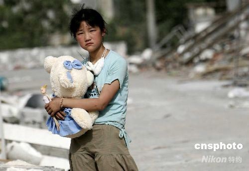 5月28日,四川平武縣南壩鎮(zhèn)的一名受災(zāi)女孩在廢墟中尋找到了自己心愛的玩具熊。平武縣在5. 12地震中損失慘重,25個鄉(xiāng)鎮(zhèn)18.6萬人全部受災(zāi)90%以上房屋全部倒塌。中新社發(fā) 杜洋 攝